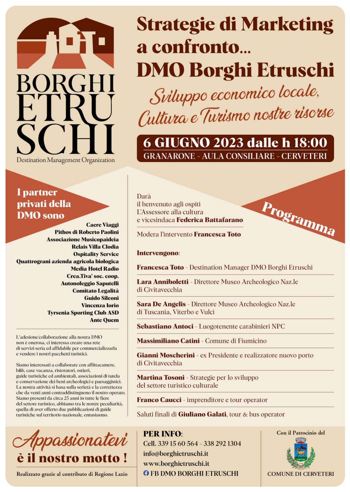 Presentazione il 6 giugno alle 18 al Granarone di Cerveteri della DMO Borghi Etruschi agli imprenditori del settore turistico ricettivo del comune di Cerveteri, alla presenza dell’Assessore Federica Battafarano. Seguirà una disamina sulle condizioni del territorio per il settore turistico-ricettivo, saranno offerti degli strumenti di marketing turistico territoriale agli imprenditori che interverranno. Coordina Francesca Toto manager DMO Borghi Etruschi.