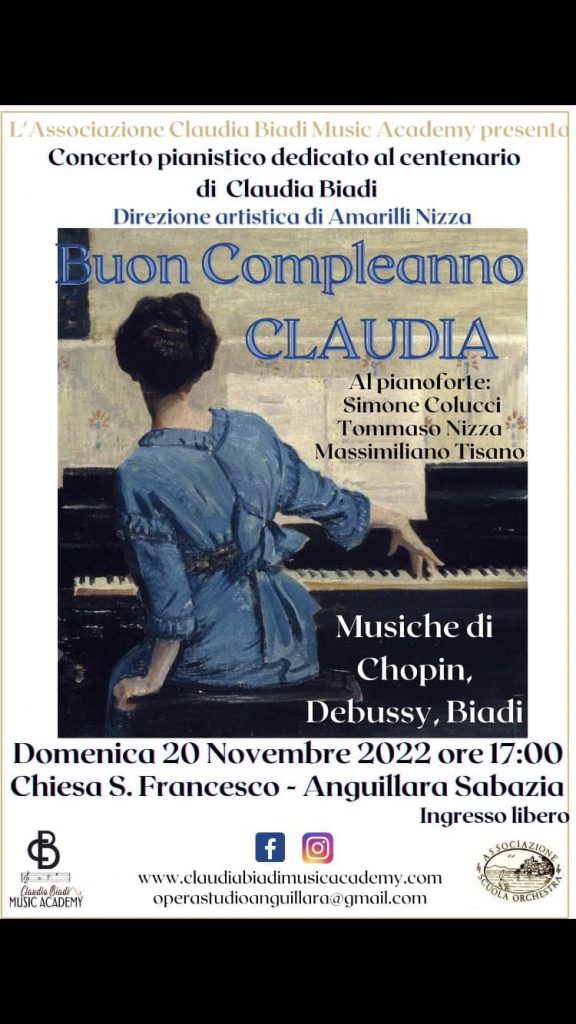 Per celebrare il centenario della nascita di Claudia Biadi Nizza, la Music Academy, a lei dedicata, promuove ad Anguillara domenica 20 novembre alle ore 17 alla chiesa di San Francesco un inedito concerto, ad ingresso libero, dal titolo “Buon Compleanno Claudia”. Si esibiranno davanti al pubblico anguillarino tre pianisti d’eccezione, Tommaso Nizza , Simone Colucci e Massimiliano Tisano, in brani di Chopin e Debussy, preferiti da Claudia Biadi Nizza. Verrà eseguito anche un brano inedito della stessa Claudia Biadi che fu una  grande artista, pianista, cantante e compositrice.  Cittadina di Anguillara, Biadi, nel 1980 fu la prima artista a fondare una scuola di musica classica (canto lirico e pianoforte ) ad Anguillara. In poco tempo la Claudia Biadi Music Academy ha promosso importanti appuntamenti tra i quali La Musica e Favola, Evento Tchaikovsky e Andromaca, melodramma in un atto del compositore di scuola napoletana Leonardo Leo al Parco Archeologico dell’Acqua Claudia. Ampio successo hanno ottenuto anche “Willie, Fiaba musicale” in una gremitissima e festante chiesa di San Biagio e il Recital “Serenate d’Estate” del tenero Stefano Osbat alla terrazza della Collegiata.