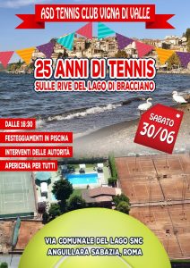 La manifestazione “25 anni di Tennis sul lago di Bracciano”, aperta a quanti vogliano partecipare, sarà una grande festa del tennis condita di festeggiamenti in piscina e apericena per tutti.