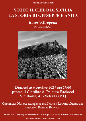 Presentazione del libro Sotto il cielo di Sicilia. La storia di Giuseppe e Anita di Rosario Dragotta domenica 6 ottobre 2024 alle 16 al Giardino di Palazzo Paolocci in via Roma 41 a Vetralla (VT)